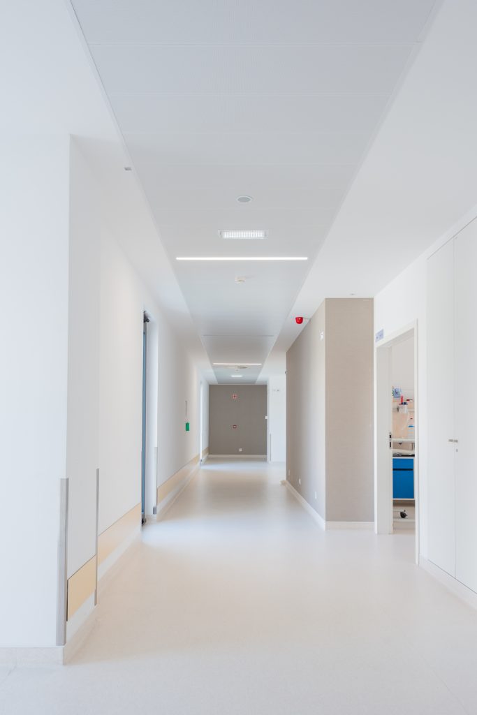 El hospital tenía claros sus requerimientos para el proyecto. En primer lugar, la estética era un factor esencial, pues un hospital debe ser un espacio que transmita calma y profesionalismo, sin perder de vista su función técnica y sanitaria. Además, el confort acústico fue una de las prioridades, dado que los ambientes hospitalarios pueden, como resultado de las actividades que en él se desarrollan, generar niveles de ruido perjudiciales para pacientes y sanitarios. Para mejorar la experiencia de los pacientes, era crucial que se minimizaran los niveles de ruido tanto en las habitaciones como en las áreas comunes. Por otro lado, el acceso al plenum para las intervenciones técnicas y mantenimiento era una necesidad crítica. Las instalaciones hospitalarias requieren de sistemas fáciles de mantener y modificar según sea necesario, ya que las tecnologías y equipos médicos evolucionan rápidamente. Esto implicaba la implementación de soluciones que permitieran un acceso rápido y sencillo para las tareas de mantenimiento y actualización de instalaciones técnicas.