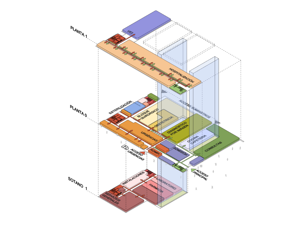 El acceso de Urgencias se efectúa directamente por la fachada paralela a la calle, y todos los accesos de suministros se concentran en la parte trasera del edificio.